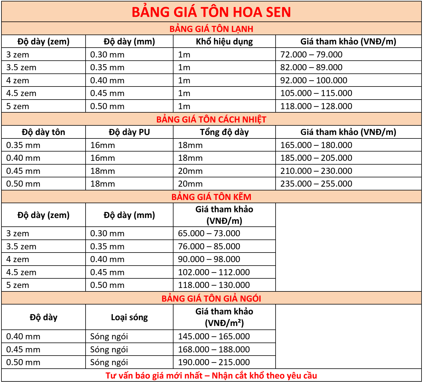 | Tôn kẽm Hoa Sen | 0.3 | 61.000 – 65.000 | Giá rẻ, dùng cho công trình tạm |